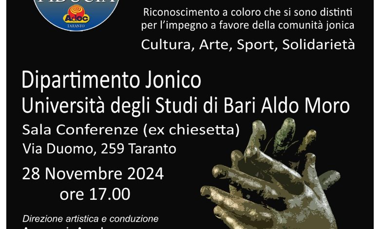 Giovedì 28 novembre, alle ore 17:00, presso la Sala Conferenze del Dipartimento Jonico dell’Università di Bari Aldo Moro a Taranto, si terrà l’ottava edizione del Premio “Fiducia – Adoc Città di Taranto”. L’iniziativa, organizzata dall’Associazione Adoc con il patrocinio del Comune di Taranto, punta a valorizzare personalità e realtà distintesi nei campi della scienza, cultura, arte, sport, imprenditoria, solidarietà e welfare.