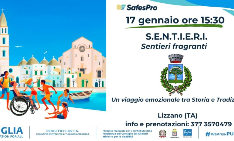 Il 17 gennaio Lizzano ospiterà Sentieri Fragranti, un evento che celebra tradizioni, sapori e inclusività nell’ambito del progetto S.E.N.T.I.E.R.I., sostenuto dalla Regione Puglia attraverso il bando C.Os.T.A.. Promosso da SAFESPRO APS, l’appuntamento punta a valorizzare il territorio con esperienze uniche pensate per tutti, inclusi coloro con disabilità.