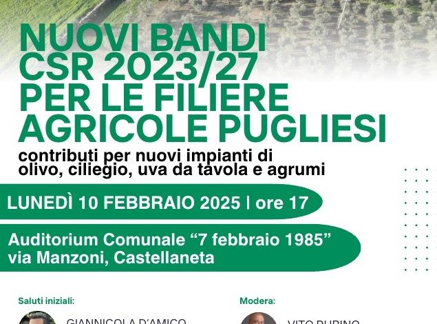 Taranto. Nuovi bandi CSR (Complemento per lo Sviluppo Rurale) 2023/2027 per le filiere agricole pugliesi: contributi per nuovi impianti di olivo, ciliegio, uva da tavola e agrumi.