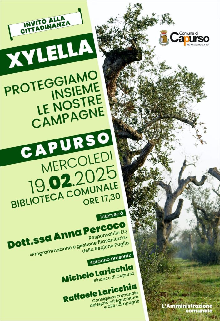Per contenere il contagio e fornire indicazioni sulle azioni da intraprendere, il Comune di Capurso ha deciso di organizzare un incontro pubblico dal titolo “Proteggiamo insieme le nostre campagne”. L’appuntamento, aperto a cittadini, agricoltori e proprietari di terreni, rappresenta un’opportunità per fare il punto sulla situazione e capire quali misure adottare per contrastare il batterio.