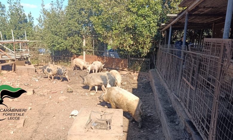 Blitz dei Carabinieri Forestali e del Servizio Veterinario ASL in un terreno agricolo a San Donato di Lecce, dove è stato scoperto un allevamento suino non registrato con 14 capi detenuti in condizioni igienico-sanitarie critiche. I maiali pascolavano tra rifiuti e deiezioni, nutriti con scarti alimentari.