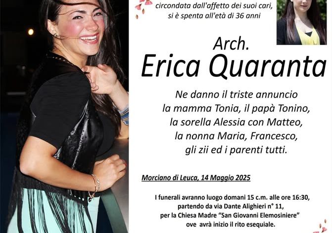 Si sono svolti nel pomeriggio di oggi, in un clima di grande partecipazione emotiva, i funerali di Erica Quaranta, 36 anni, di cui gli ultimi tre e oltre vissuti sospesi, nel limbo fra la vita e la morte.
