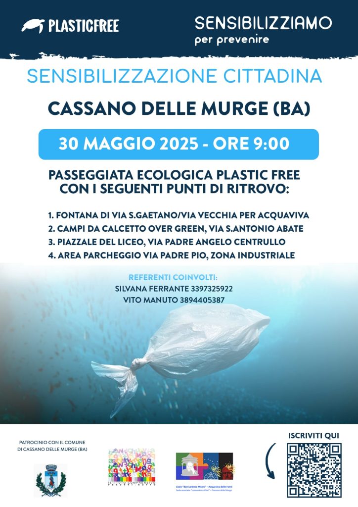 Una grande giornata di sostenibilità ambientale è in programma a Cassano delle Murge venerdì 30 maggio 2025, quando oltre 300 studenti degli istituti scolastici locali scenderanno in strada per partecipare a un’importante iniziativa ambientale promossa da Plastic Free Onlus. L’evento, che avrà luogo dalle 9:00 alle 12:30, coinvolgerà giovani di ogni ordine e grado nella raccolta dei rifiuti abbandonati lungo le vie cittadine.