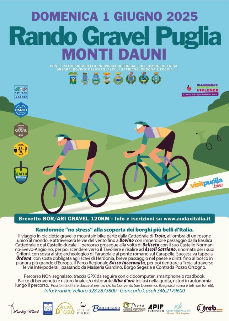 L’evento è patrocinato dalla Provincia di Foggia e dai Comuni di Troia, Orsara di Puglia, Bovino, Deliceto, Ascoli Satriano, Ordona e Foggia. Per informazioni e iscrizioni: www.audaxitalia.it.