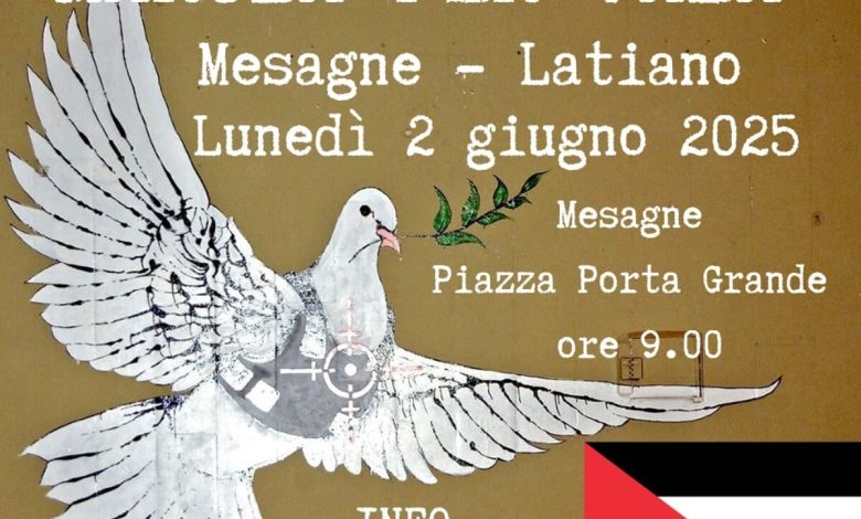 Domattina, con partenza alle ore 9 da piazza Vittorio Emanuele a Mesagne, è stata organizzata una marcia pacifica, un gesto simbolico che ha lo scopo di manifestare l’enorme indignazione nei confronti di quanto sta accadendo, sotto gli occhi del mondo, nella martoriata Striscia di Gaza.