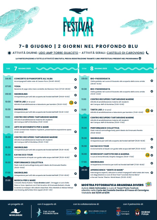 La parola chiave principale “Festivalmar a Torre Guaceto” accompagna un evento che intende promuovere la conoscenza e la tutela dell’ecosistema marino attraverso attività adatte a tutte le età: snorkeling, yoga, concerti, mostre, performance artistiche e momenti di approfondimento scientifico. L’iniziativa, supportata da The Plum Foundation e patrocinata da Regione Puglia e Comune di Carovigno, è pensata per sensibilizzare cittadini e turisti sull’importanza di uno sviluppo sostenibile e responsabile.