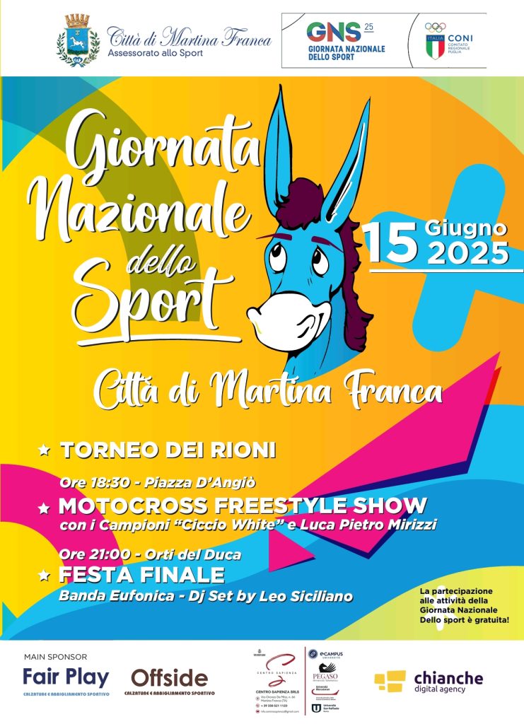 Lo sport è vita: un’opportunità per tutti! Il 15 giugno 2025 Martina Franca si trasforma in un palcoscenico di emozioni, adrenalina e passione! Che tu abbia pochi anni o un secolo, lo sport è una porta aperta verso il benessere, l’incontro e la felicità. È disciplina, rispetto, e soprattutto divertimento.