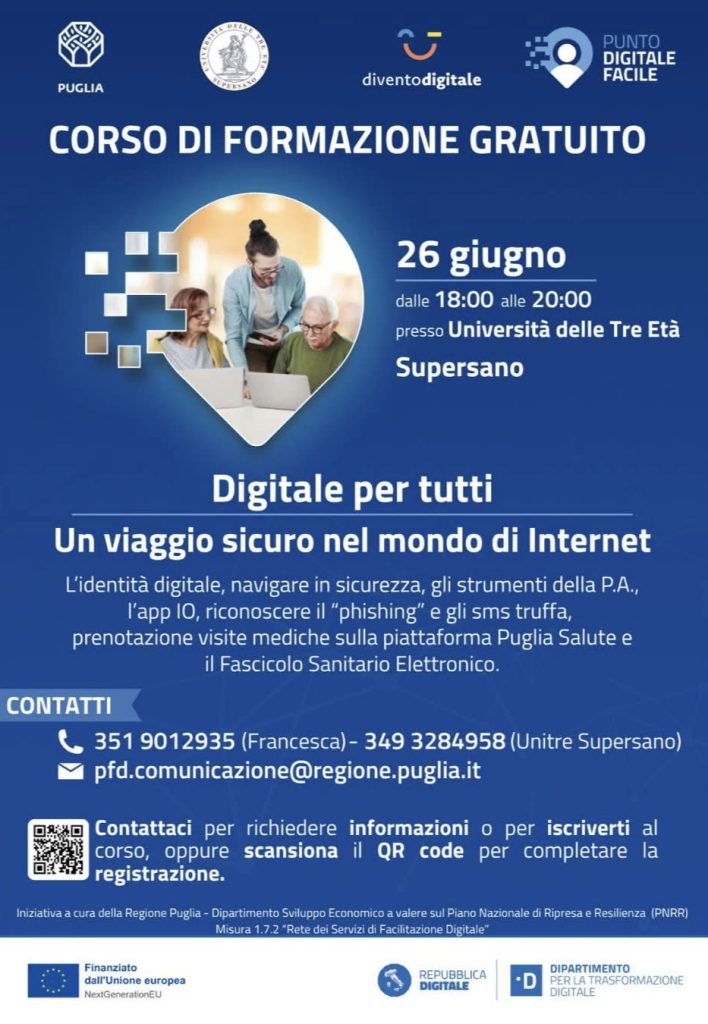 “Digitale per tutti: un viaggio sicuro nel mondo di Internet”, un’iniziativa promossa dal Punto Digitale Facile in collaborazione con l’Università della Terza Età di Supersano. L’evento si terrà giovedì 26 giugno presso la sede dell’Università delle Tre Età, in via Vittorio Emanuele 68 a Supersano. Durante il corso, i partecipanti potranno approfondire temi essenziali per un utilizzo consapevole delle risorse digitali, tra cui l’identità digitale, gli strumenti della Pubblica Amministrazione, l’app IO, il riconoscimento delle truffe online come il phishing e gli SMS fraudolenti, la piattaforma Puglia Salute e il Fascicolo Sanitario Elettronico.
