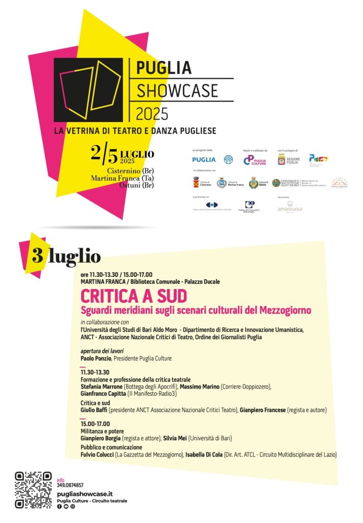 Il programma inizia mercoledì 3 luglio con il convegno “Critica a Sud – Sguardi meridiani sugli scenari culturali del Mezzogiorno”. L’incontro si svolge in due sessioni (11:30-13:30 e 15:00-17:00) presso la Biblioteca Comunale Isidoro Chirulli, nel Palazzo Ducale. Ogni sessione dà diritto a 2 crediti formativi riconosciuti dall’Ordine dei Giornalisti.