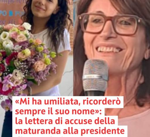 La lettera che l’alunna ha pubblicato è peraltro firmata da alcuni suoi compagni di classe, anch’essi a quanto pare intenzionati a chiedere l’accesso agli atti, poiché sentitisi penalizzati dall’atteggiamento avuto dalla Presidente Vantaggiato, la quale ha replicato di cadere dalle nuvole rispetto alle accuse mossele, di aver condiviso giudizi e valutazioni con assoluta serenità con tutti i membri della commissione d’esame.
