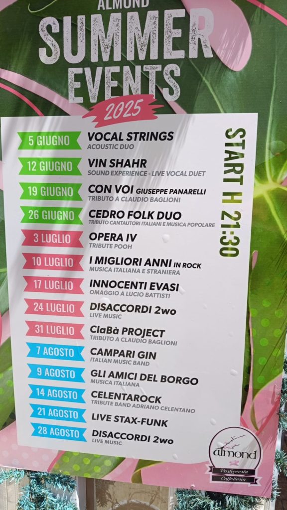 In estate, il giardino di Almond accoglie eventi con musica folk e pizzica, creando serate suggestive tra ulivi, sapori e convivialità.