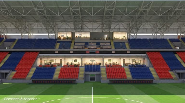 L’immagine che accompagna queste parole parla da sola: gradinate simmetriche, colori che richiamano la storia e la passione, spazi dedicati alla stampa e agli ospiti, una struttura coperta che protegge e accoglie. Il progetto firmato da Cecchetto & Associati è una sintesi di estetica e funzionalità, pensato per ospitare non solo partite, ma eventi, sogni, emozioni.