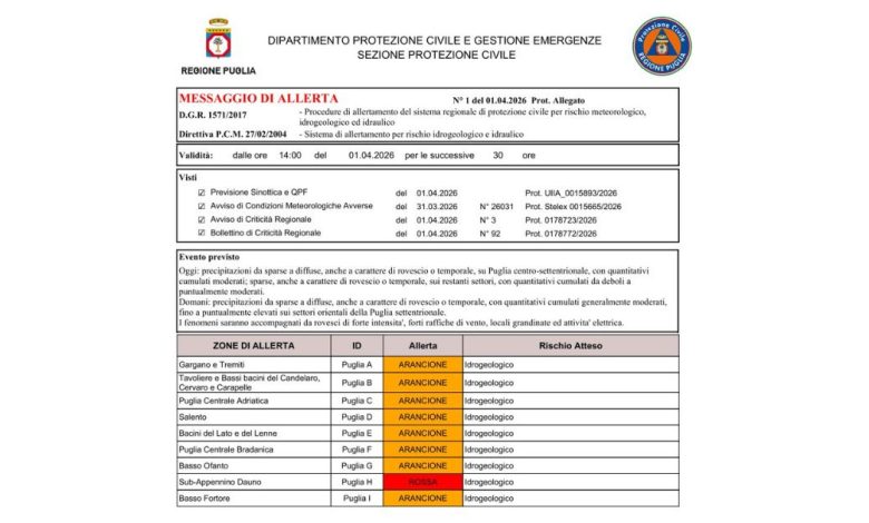 Il dato più importante riguarda il Sub-Appennino Dauno. Per quest’area la Regione ha indicato allerta rossa per rischio idrogeologico nel messaggio valido dalle 14 del 1° aprile per le successive 30 ore. Nello stesso avviso compare l’allerta arancione per Gargano e Tremiti, Tavoliere e bassi bacini del Candelaro, Cervaro e Carapelle, Puglia centrale adriatica, Salento, bacini del Lato e del Lenne, Puglia centrale bradanica, Basso Ofanto e Basso Fortore. In questa fase la struttura regionale ha attivato il preallarme.