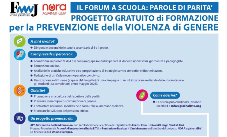 A promuovere il percorso è APS Giornaliste del Mediterraneo, che ha costruito un programma di ricerca e formazione centrato sulla decostruzione di stereotipi e discriminazioni sessiste ancora presenti nei contenuti mediatici, nelle pratiche educative e nei linguaggi quotidiani. Un terreno che oggi si allarga anche agli strumenti di intelligenza artificiale, sempre più usati in ambito scolastico e comunicativo.