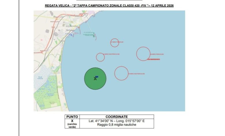 La regata velica a Manfredonia il 12 aprile 2026 entra nella fase operativa. La Capitaneria di Porto di Manfredonia ha pubblicato l’ordinanza che disciplina lo svolgimento della 2ª Tappa del Campionato Zonale classi 420 FIV, in programma domenica 12 aprile nello specchio d’acqua antistante il litorale tra Manfredonia e Siponto. L’organizzazione è affidata al Centro Velico Gargano.