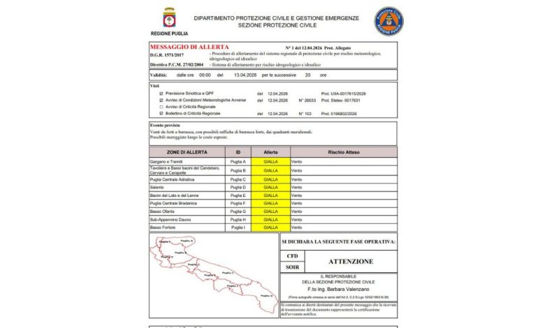 La situazione sarà monitorata nelle prossime ore attraverso i bollettini ufficiali della Protezione civile regionale. Per cittadini e Comuni il riferimento resta l’aggiornamento costante dei messaggi di allerta, che indicano durata del fenomeno e zone coinvolte. Per lunedì, dunque, la parola d’ordine è cautela: la Puglia si prepara a una giornata segnata soprattutto da vento forte e mareggiate.