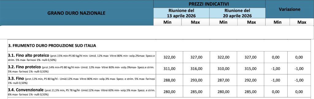 Secondo CIA Puglia, il problema è evidente nei numeri. Per il 2025, ISMEA aveva indicato in 318 euro a tonnellata il costo medio di produzione nel Centro-Sud. Il listino diffuso dalla CUN il 20 aprile, invece, ha collocato gran parte delle tipologie sotto quella soglia. Il “fino proteico” è stato indicato tra 310 e 315 euro a tonnellata, il “fino” tra 287 e 292 euro, mentre il “convenzionale” si è fermato tra 280 e 285 euro. Solo il “fino alto proteico”, che riguarda però una quota limitata del raccolto, supera il livello indicato da ISMEA, con valori tra 322 e 327 euro.