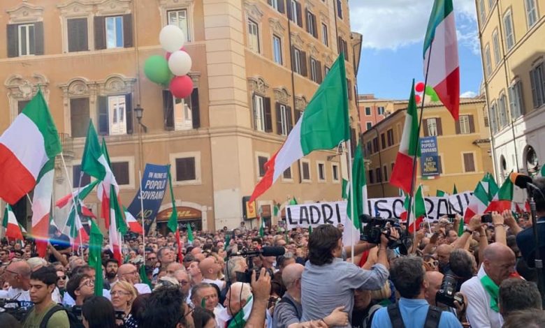 Mentre Conte pronunciava il suo discorso alla Camera per chiedere il voto di fiducia (I sì sono stati 343, i no 263, gli astenuti 3), 30 mila persone manifestavano con le bandiere tricolore e diversi striscioni: “Ladri di sovranità”, “In nome del popolo sovrano”, “No al patto della poltrona”, alcuni degli slogan.
