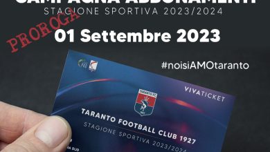 La società Taranto FC 1927 comunica che il termine della campagna abbonamenti, inizialmente previsto per domenica 27 agosto, è stato prorogato a venerdì 1 settembre. L’acquisto degli abbonamenti…