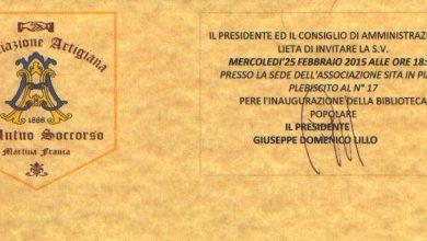 L’Associazione Artigiana di Martina Franca annuncia l’inaugurazione della Biblioteca Popolare, che si svolgeràMercoledì 25 Febbraio 2015 alle ore 18.30 presso…