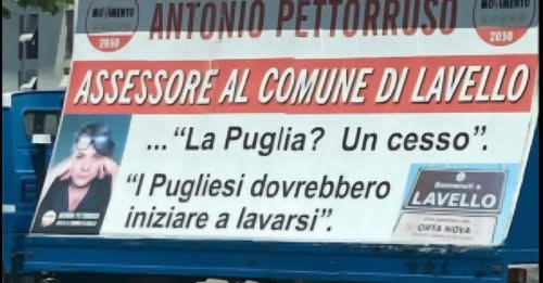 Come si spiega allora quel camion sul quale la Puglia ed i pugliesi venivano così volgarmente sbeffeggiati? Si spiegherebbe, ha riferito Pettorruso, con il risentimento di un personaggio di Lavello, conosciuto col soprannome di “Dartagnan”, il quale dopo l’esito delle elezioni comunali di Lavello della scorsa primavera, nelle quali la coalizione comprendente Pettorruso ha vinto, ha voluto rivalersi su quest’ultimo, recuperando allo scopo frasi che scherzosamente, tuttavia, Pettorruso aveva utilizzato su facebook scherzando con degli amici, e costruendo su quelle i manifesti diffamatori nei confronti della Puglia, al fine di mettere in cattiva luce Pettorruso.