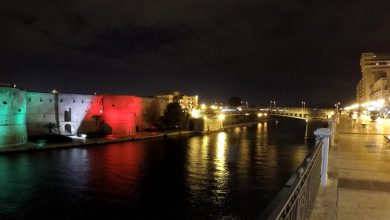 Taranto – Il Castello Aragonese illuminato con il tricolore