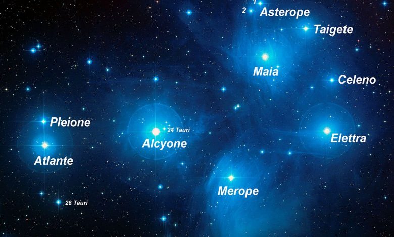Secondo gli antichi greci, ai quale dobbiamo non solo i nomi delle costellazioni, che derivano dalla loro sofisticata mitologia, ma anche le prime indagini sulla natura delle stelle e finanche raffinati calcoli sull’effettiva distanza di questi corpi celesti, oltre che sulle dimensioni della Terra, le Pleiadi erano sette sorelle di nome Maia, Elettra, Taigete, Asterope, Alcione, Celeno e Merope, figlie del dio Atlante, la cui posizione in cielo vicino ad Orione si deve alla seguente storia: compagno della dea della Caccia, Artemide, Orione ne provocò l’ira funesta proprio innamorandosi delle sette sorelle figlie di Atlante. Per vendicarsi, la dea allora mandò contro Orione uno scorpione che lo punse a morte, per questo servizio reso ad Artemide lo scorpione fu tramutato in costellazione; stessa sorte toccò ad Orione e alle Pleiadi.