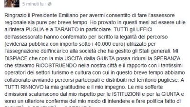 Gianni Liviano, assessore regionale al Turismo (unico tarantino in Giunta regionale), ha rassegnato le sue dimissioni dall’incarico. Liviano in una…