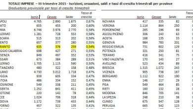 MOVIMPRESE, SALDO POSITIVO NEL 3° TRIMESTRE 2015 MA IL SISTEMA ECONOMICO SOFFRE ANCORA Sportelli: Taranto dimostra una certa vitalità anagrafica…