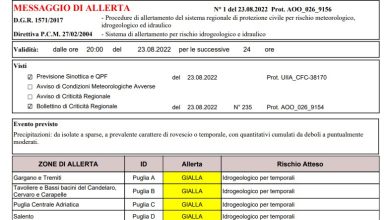 La Protezione Civile ha diramato un’allerta gialla per la Puglia, a partire dalla mezzanotte del 10 settembre e per le…