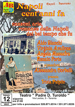 Taranto-al P. Turoldo: Napoli del tempo che fu. Aldo Bianchi tenore tarantino, molto conosciuto all’estero, specie negli Stati Uniti, e in Sud Africa. A Taranto con Napoli cent’anni fa