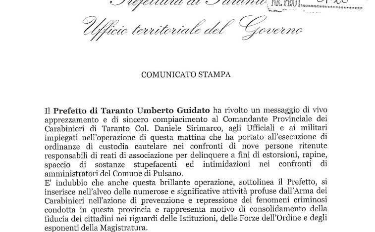 Operazione NO ONE: Nota del Prefetto Guidato sull’operazione dei Carabinieri.