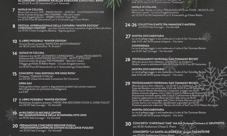 Dal Presepe Vivente che quest’anno taglia il traguardo della XX edizione al concerto dei Terraross feat Mama Marjas & Don Ciccio. E poi i festeggiamenti patronali in onore di San Tommaso Becket con rievocatori e artigiani e uno spettacolo di luci e suoni sulla vita di colui che fu Arcivescovo di Canterbury. E ancora la duplice tappa della rassegna Il Libro Possibile- Winter Edition, i mercatini e i percorsi enogastronomici. Mottola svela il suo ricchissimo cartellone di eventi natalizi, realizzato grazie ad una sinergia tra amministrazione, operatori e associazioni. Tantissime iniziative per un pubblico variegato, in arrivo da tutta la Regione.