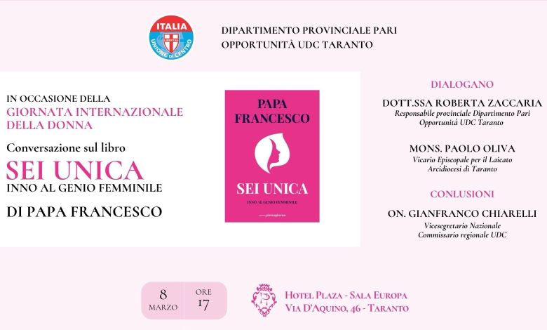 Il dipartimento provinciale Pari opportunità UDC di Taranto, in occasione della Giornata internazionale della donna, organizza l’evento “Sei Unica” conversazione sul libro di Papa Francesco.