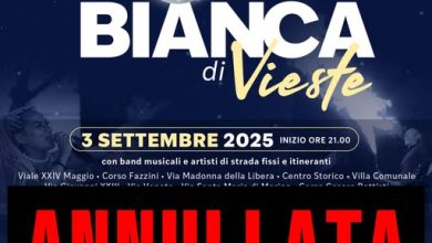 L’Amministrazione comunale di Vieste ha deciso di annullare la “notte bianca”, che avrebbe dovuto tenersi questa sera, come gesto di…